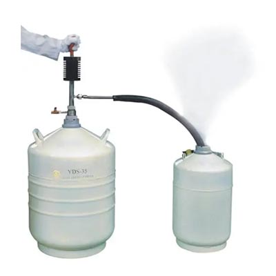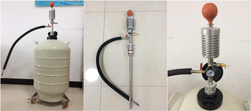 該產(chǎn)品依靠操作者手捏吸液球(ZYB-5型),使液氮容器內(nèi)貯存的液氮少量產(chǎn)生氣化。由于液氮的氣液體積比較大,氣化后的氮氣在密封的容器內(nèi)對盛裝的液氮增壓,促使容器內(nèi)盛裝的液氮排放出來,達(dá)到對其它容器補(bǔ)充液氮的目的。它具有操作方便可靠、排液過程中液氮的蒸發(fā)損失低的優(yōu)點。